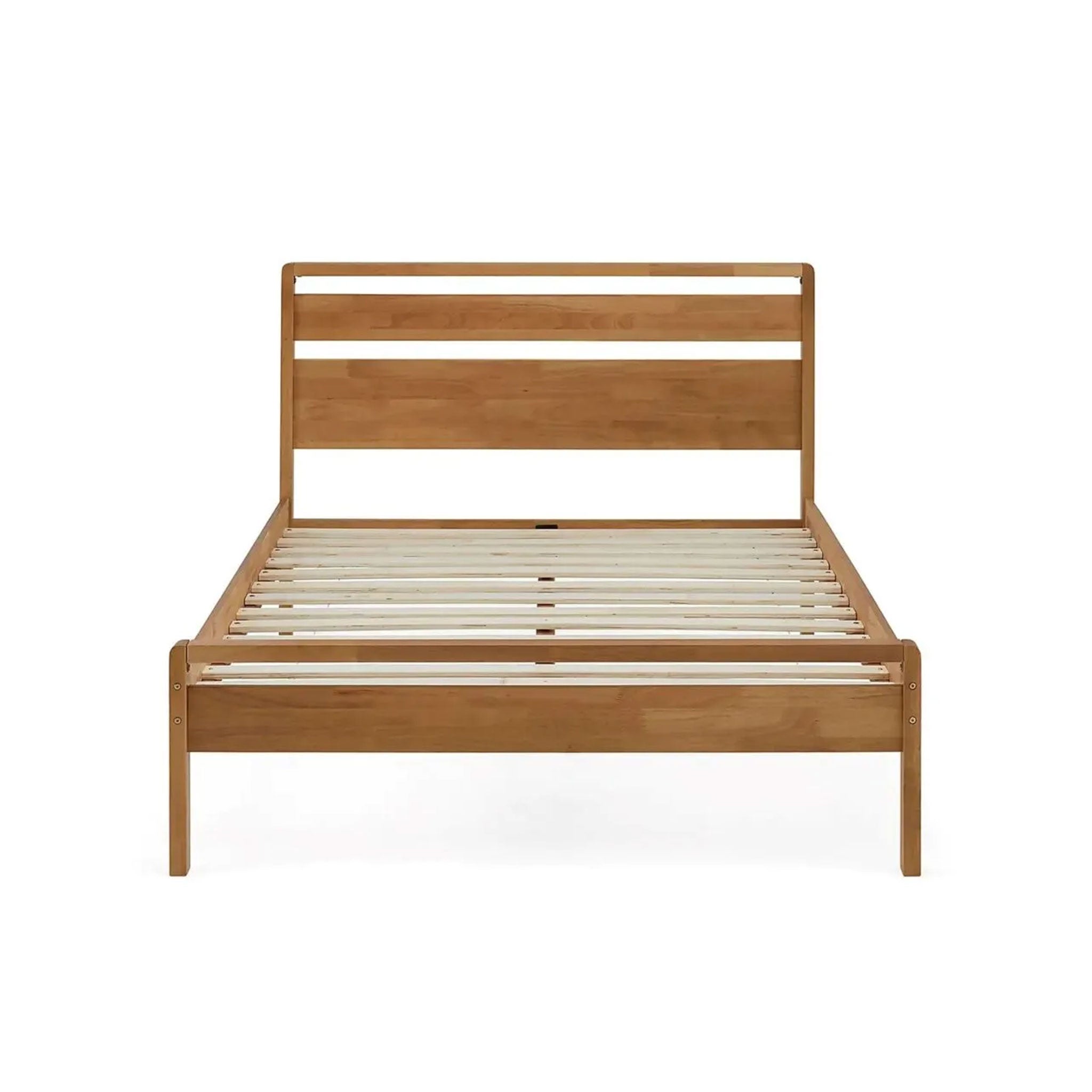 Crafted with care and built for durability, the frame features solid wooden slats and two centre-support feet, ensuring long-lasting, dependable support. The sleek slatted headboard adds a touch of contemporary charm — a subtle yet striking detail that elevates any space with effortless style.